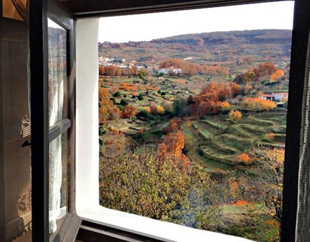 El Pasadizo situada en la ladera de la montaña, entre bosques de castaños, robles, cerezos... Valle del Jerte.
